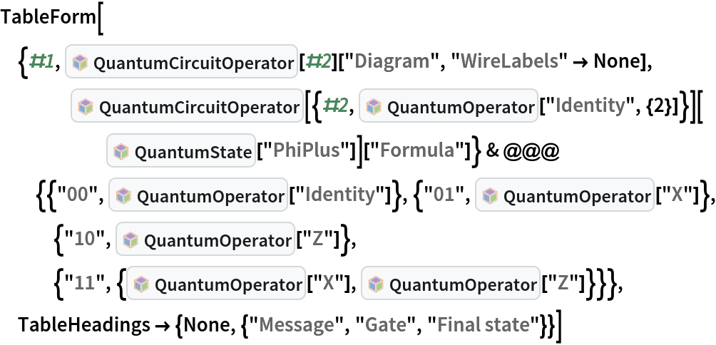 Such operations can be represented as circuits, each with a final state resulting from application of its respective gate(s) to the initial Bell state: