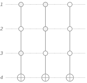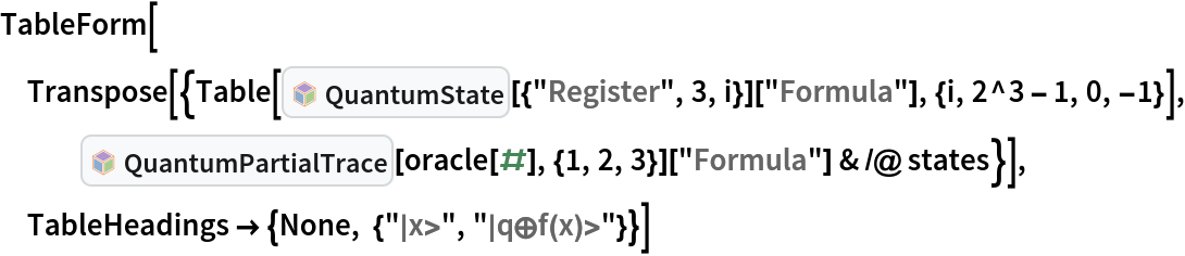 Prepare the 4-qubit in the previous circuit (i.e. the ancillary qubit) as a 0-state, and then other qubits (1–3) in the index register states. To compare with the truth table, create the index register states |x> in the order |2n-1> down to |0: