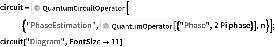 To specify the corresponding quantum circuit, one can use the built-in circuit "PhaseEstimation" that takes two input arguments: a unitary operator U and an integer n. The integer n specifies the number of qubits and controlled-Uj operators in the circuit, with j=0,1,…,n-1. The accuracy of phase estimation and the success probability depends on n: