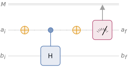 Measurement operators can also be added to a quantum circuit. For a single-qubit unitary operator with eigenvalues ±1, a measurement of can be implemented in the following circuit (note that here, Pauli-Y is considered a operator):