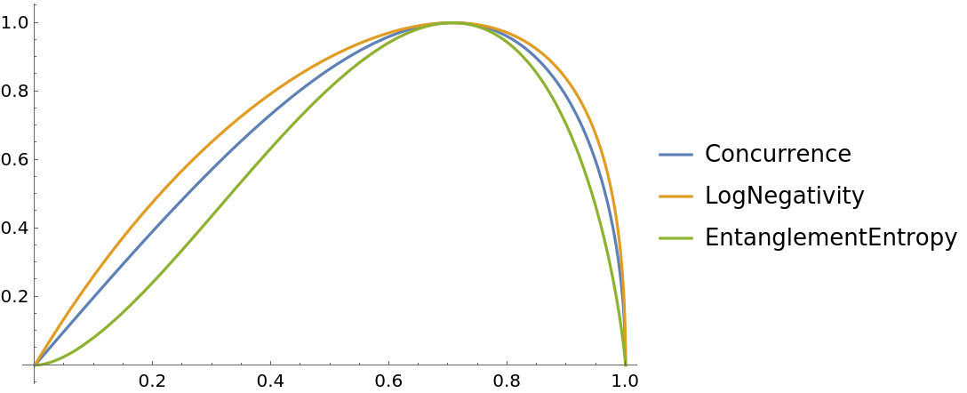 There are several metrics by which one can measure entanglement between two qudits, such as concurrence, entanglement entropy, negativity, etc. The calculation of entanglement measure is represented by the QuantumEntanglementMonotone function.