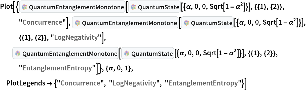 There are several metrics by which one can measure entanglement between two qudits, such as concurrence, entanglement entropy, negativity, etc. The calculation of entanglement measure is represented by the QuantumEntanglementMonotone function.