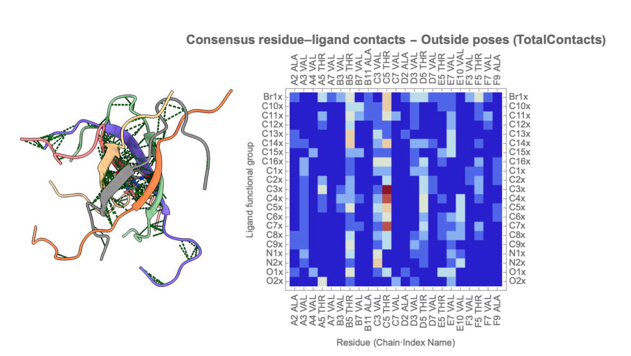 ProteinLigandInteractionAnalysis is a Mathematica paclet designed to provide a complete, reproducible framework for quantitative analysis of protein–ligand interactions, particularly within oligomeric and β-barrel–like assemblies such as NACore hexamers. The paclet offers an end-to-end workflow that includes automated PDB parsing, extraction of barrel geometry parameters, ligand functional-group annotation, computation of residue-level contact statistics, and categorical pose classification (Inside / Borderline / Outside). Its modular architecture standardizes core metrics—such as radial and axial ligand COM positions, pore-occupancy fractions, and contact-based interaction fingerprints—enabling rapid comparison across large pose ensembles like 50-structure docking outputs. In addition, ProteinLigandInteractionAnalysis provides powerful visualization functions for annotated molecular renderings, consensus heatmaps, and curated pose summaries, making it easy to evaluate binding trends across multiple ligands or sequence variants. Together, these tools form a flexible and extensible platform for high-resolution structure-based interpretation of protein–ligand binding behavior.
